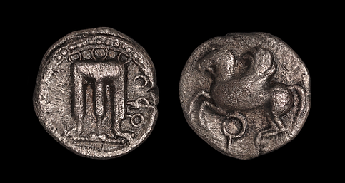 Bruttium, Kroton. 525-425 BC. Obv. Delphic tripod. Right, ϘPO (retrograde). Rev. Pegasus in flight left, Ϙ below.